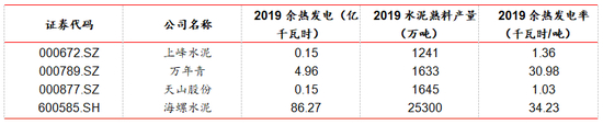 为使能源高效利用,水泥行业主流技术是将煅烧产生的废弃余热进行回收并转换成电能,一般可以减少企业电能消耗30%以上。根据公开数据,我们以几家水泥上市企业的余热回收发电量与其熟料产量进行了比对如下:
