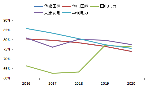 我们以传统的五大发电集团主体上市公司作为研究对象(国家电投暂无主体上市,以华润电力代替),观察其火电业务的占比及变化趋势。从装机结构来看,近年来各大上市公司火电装机占比整体上呈现逐步下降趋势,国电电力火电装机占比有所提升主要系2019年重大资产重组合并部分神华集团体内火电资产所致。截止2020年,华能国际、华电国际、国电电力、大唐发电和华润电力五大电力上市企业火电装机占比基本上均在75%左右(华能国际、华电国际为煤电口径),五大电力上市企业合计火电装机达2.88亿千瓦,约占全国火电装机的23%左右。