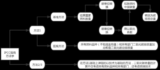IPCC指南推荐采用三层方法(方法1、方法2、方法3)来计算碳排放量,方法1从估算供给国家燃料的碳含量/主要燃烧活动(不同来源类别)排放量来进行计算,分为基准方法与区段方法,基准方法为估算国家燃料数量(表观消费)→碳单位转换→扣除燃料中固碳部分的碳量→乘以氧化系数对未氧化碳进行折算→转换为二氧化碳总排放量;区段方法为所有燃料品种(不包括生物量)和所有部门二氧化碳排放量加总即是二氧化碳总排放量。