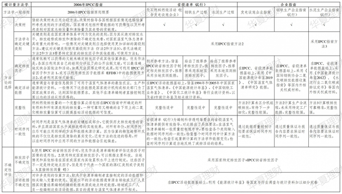 在省级温室气体清单编制指南基础上,水泥生产企业指南一是参考了世界可持续发展工商理事会(WBCSD)、美国、欧盟等相关排放报告文件,二是从IPCC方法学角度,类似于钢铁生产企业指南,省级清单是参照方法2基于水泥生产熟料产量,直接依据熟料生产数据(不是从来水泥产量推断熟料产量)和国家特定排放因子计算排放;水泥生产企业指南则参照方法3,将计算数据详细到生产熟料时消耗的碳酸盐类型(成分)区分,以及消耗碳酸盐的各排放因子;IPCC方法3推荐水泥生产企业碳排放量计算要考虑碳酸盐排放+未回收到炉窑中未煅烧CKD排放+碳类非燃料排放,水泥生产企业指南计算方法则覆盖了方法3中内容,特地在工业过程燃烧排放中区分了碳酸盐分解产生的三类排放(熟料对应的碳排放量、窑炉排气筒粉尘对应的碳排放量、旁路防风粉尘对应的碳排放量)。水泥生产企业指南目前虽未发布正式版本,指南试行版碳计量方法已按照IPCC优良做法原则开展详尽的水泥企业碳排放量计算。