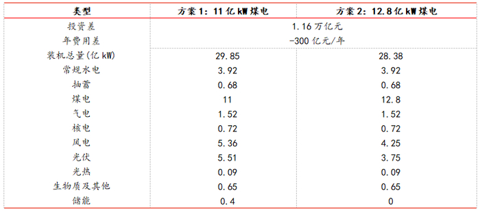 表4-1. 电力行业“碳达峰”不同煤电装机方案比较