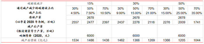 钢铁企业主要排放源来自燃料燃烧产生的二氧化碳,而现阶段主要以控制新增产能及新技术应用减少企业二氧化碳的产生。而上述两种路径的应用对企业营收、能源结构性变化有着不同影响。仍以华菱企业为例,假设通过减少产能控制二氧化碳的产生,设置3个不同场景,分别为30%/50%/70%的减碳量由减少产量实现,测算在2020年排放量下降15%/30%/50%时的营收情况,如下: