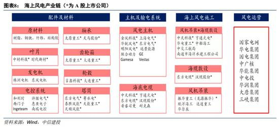 风电产业链:风电行业产业链主要包括原材料企业、零部件制造商、风电整机制造商、风电运营商四大环节。