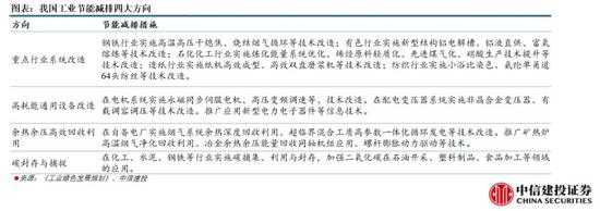 在碳达峰的背景下,我国工业将加快节能减排改造。从具体措施来看,我国工业节能减排主要通过传统工业领域系统改造、高耗能通用设备改造、余热余压高效回收利用、碳封存与捕捉等措施来实现节能减排。