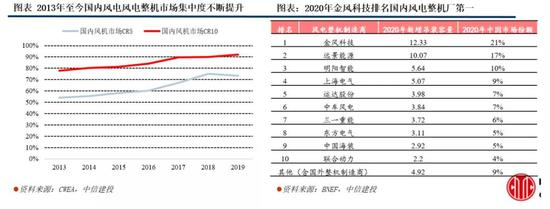 国内风电整机市场(含原材料及零部件)规模超千亿,行业集中度高。从风电场资本开支构成来看,国内风电整机市场(含原材料及零部件)规模超千亿元。风电场资本开支由风电整机、系统平衡(电气基础设施、组装和安装)以及财务费用(保险、建筑融资等)组成,其中陆地风电场资本开支中风电整机投入占比约65-70%,以此推算,国内风电整机市场(含原材料及零部件)规模超千亿元。