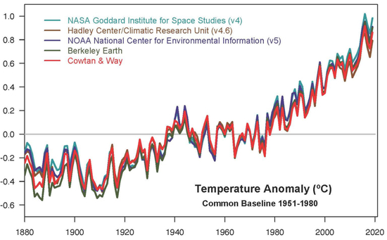根据美国宇航局(NASA)的一项分析,自19世纪末以来,由于人类活动造成的二氧化碳、甲烷等温室气体的排放已经使地球的平均温度上升了1.2摄氏度左右。而刚刚过去的2020年则是全球范围内有记录以来最热的一年(2020年以微弱优势超过了之前的最热记录2016年)。