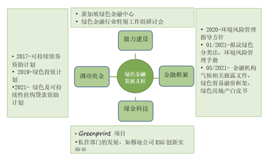 在绿色金融框架方面,新加坡制定了环境风险管理准则、绿色分类法、环境风险管理手册、金融机构气候相关披露文件及其他各类绿色金融文件,通过这些举措贯彻落实绿色行动计划、完善绿色金融框架。