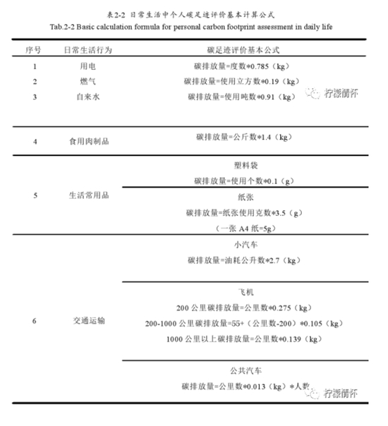 碳计算器是一种计算工具,它主要存在于互联网,可以用于测算个人或家庭基于人数、住房面积、能源资源消耗量等计算日常活动全过程中所产生的二氧化碳排放总量。这个计算相对复杂,根据不同的人的不同活动轨迹,碳计算器需要考虑到一切用于日常活动的能源,包括电能、运输等。但是用碳计算器来核算碳足迹是极为方便且容易的,只要根据提示输入相应的数据即可,碳计算器网站将提供计算结果、当前国家和世界的平均值,以及减少碳足迹的合理建议。如果能明白我们的日常行为产生的碳足迹有多少、从哪来,那我们就可以从源头减少,以达到减少温室气体排放,减缓气候变化速度的最终目的。日常生活中常用的个人碳足迹评价基本计算公式见表 2-2。