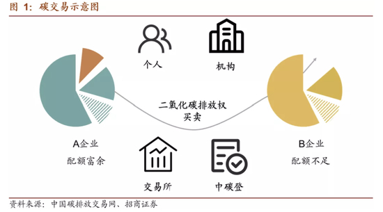 碳交易市场是由政府通过对能耗企业的控制排放而人为制造的市场。通常情况下,政府确定一个碳排放总额,并根据一定规则将碳排放配额分配至企业。如果未来企业排放高于配额,需要到市场上购买配额。与此同时,部分企业通过采用节能减排技术,最终碳排放低于其获得的配额,则可以通过碳交易市场出售多余配额。双方一般通过碳排放交易所进行交易。