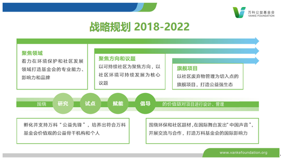 万科公益基金会是民政部主管的全国性非公募基金会,由王石先生担任理事长。2018年以来,万科公益基金会在新的五年战略规划框架下,以“面向未来,敢为人先”为理念,以“可持续社区”为目标,推动实现人与社会、人与自然之间和谐共进的关系。基金会当前着重围绕社区废弃物管理、绿色环保、社区发展和专项支持四大业务领域开展工作,聚焦以社区废弃物管理为切入点的旗舰项目,打造公益强生态。