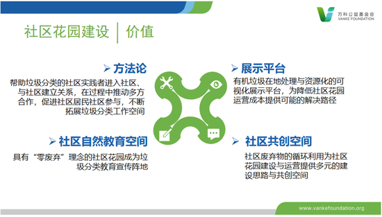 自2018年确立社区废弃物管理旗舰项目后,万科公益基金会探索了垃圾处理的前、中、后端。陈一梅女士提到,正是在可持续社区建设的过程中,万科公益基金会发现社区不是一个单纯技术的、物理的、硬件的、一次性工作的地方,而是一种动态,需要在社区废弃物管理实践不断推进的过程中,同步推动社区的可持续发展。