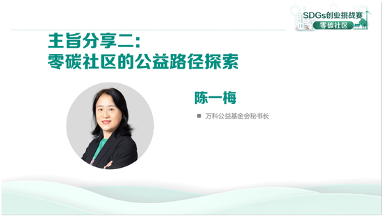 万科公益基金会的秘书长陈一梅女士进行了主题为“零碳社区的公益路径探索”的分享,讲述公益与零碳社区的关系。
