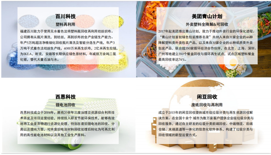 卢琦女士为我们分享了城市再生资源循环领域的4个案例:百川科技(塑料再利用)、美团青山计划(外卖塑料全降解&可回收)、西恩科技(锂电池回收)、闲豆回收(废纸回收与再利用),其中百川科技已为宜家、耐克、阿迪达斯等大品牌供货,闲豆的客户也不仅限于社区或消费场景,拥有很多B端客户。