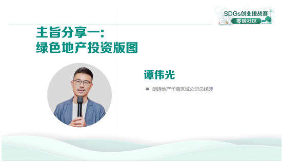 朗诗地产华南区域公司总经理谭伟光先生发表主题为“科技助力碳中和的实践”的主旨演讲,分享碳中和背景下地产企业的低碳实践。