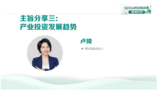 青云创投合伙人卢琦女士进行了主题为 “零碳社区与产业投资趋势”的分享,针对零碳社区的几个重要相关领域,分享了她在关注的投资机会及投资案例。