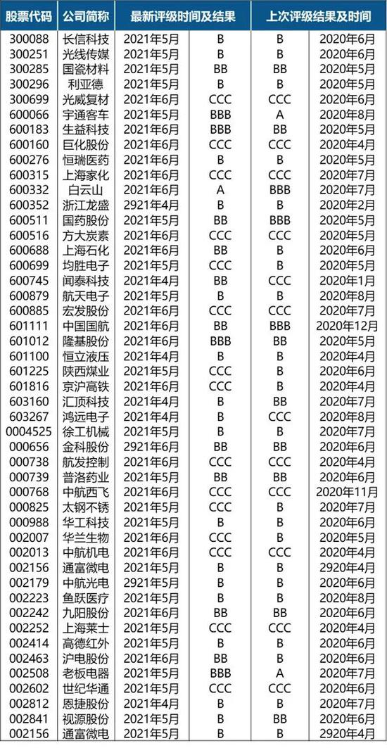 陕西煤业(601225)、太钢不锈(000825)、华兰生物(002007)、均胜电子(600699)、京沪高铁(601816)降到了最低一档的CCC级;