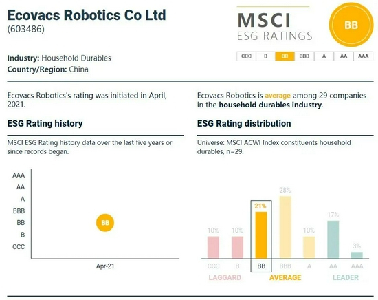 科沃斯(603486)获得BB级,其公司治理(corporate governance)、劳工管理(labor management)、供应链劳工标准(supply chain labor standards)三项议题的表现处于行业平均水平;但商业行为(corporate behavior)、争议采购(controversial sourcing)、电子垃圾(electronic waste)三项议题的表现处于行业落后水平。