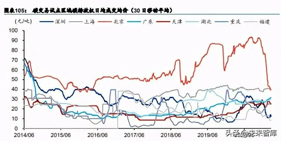政策推动碳交易制度完善,奠定碳金融市场良好基础。2011 年 10 月国家发展改革委印发 《关于开展碳排放权交易试点工作的通知》,批准北京、上海、天津、重庆、湖北、广东和 深圳等七省市开展碳交易试点工作。2013 年 6 月 18 日,深圳碳排放权交易市场在全国七 家试点省市中率先启动交易,此后其他试点陆续开始交易。从历史交易价格看,各地区存 在一定差异,北京、上海地区碳排放日均成交价高于其他地区(20-40 元/吨左右)。2017 年 12 月,发改委发布《全国碳排放权交易市场建设方案(发电行业)》,明确了全国碳市场 建设的基本原则、基本要素和基本框架等。2021 年 1 月,生态环境部发布《碳排放权交易 管理办法(试行)》,标志着全国碳市场发电行业第一个履约周期正式启动,愈 2000 家发电 企业将分到碳排放配额。我们认为,政策逐步推动碳交易制度完善,将为碳金融市场奠定 良好基础。