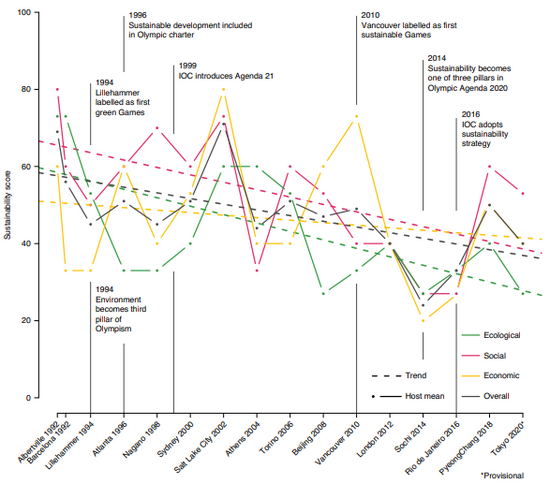 最晚从2010年开始,“举办可持续的奥运会”就逐渐成为主办方的重点宣传内容,但从16届奥运会各自在此研究中的评估分数来看,奥运会似乎有一种“越开越不持续”的趋势。时间距离较近的2014年索契奥运会和2016年里约热内卢奥运会的可持续性在所有样本中排在倒数第一和第二,此次2020年东京奥运会位列倒数第三。