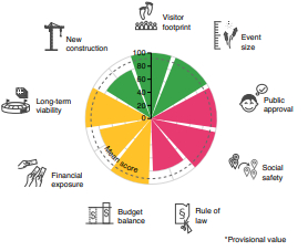 上图为研究采用的评估框架,该框架认为可持续的奥运会应该具有有限的生态足迹(绿色部分),增强社会公平(粉色部分),并能体现长期的经济效益(黄色部分)。其中,生态足迹细分为全新建筑物、游客足迹、活动规模;社会公平细分为公众认可度、社会安全、法治;经济效益细分为预算平衡、财政风险、长期可行性。