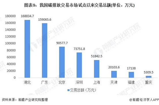 根据中国碳排放交易网公布的数据来看从2013年各地试点以来,湖北省的碳排放权交易总额为七个地区之中最高为16.88亿元。