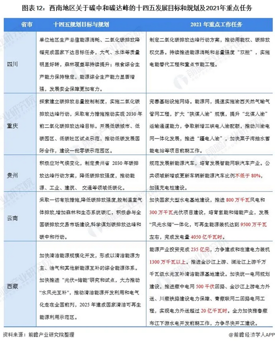 西南地区包括重庆市、四川省、贵州省、云南省、西藏自治区共五个省市区。西南地区位处于长江中上游,覆盖云贵高原和青藏高原南部,在发展水力发电和光伏发电以及风力发电有较好的自然条件。在西南地区各省政府在十四五规划目标和2021年重点工作任务也主要围绕着水力发电和风电等新能源发电项目为主。其中云南和西藏等省份更是在2021年工作任务中直接提出了相关项目建设要求和目标。