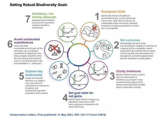 该论文题为《制定稳健的生物多样性目标》(“Setting Robust Biodiversity Goals”,可点击文末阅读原文详细阅读)。若未就环境保护成效设定明确目标,就给“宽松的”解读留下空间,从而导致不合理的环境保护结果。为了降低这样的风险,该论文设立了七项原则,对制定更加明晰具体的净产出目标提出要求,尤其是帮助强化全球生物多样性框架(GBF)以及设定总体保护目标。