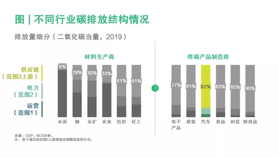 为了让大家更直观地了解汽车供应链的碳排放有多“凶猛”,我们对不同行业的碳排放结构进行细化呈现: