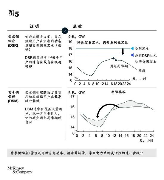 加强需求侧管理与响应:除提升供给侧的灵活性之外,需求侧的改革也是降低储能系统成本、提升电力系统稳定性的有效手段。当前的需求侧改善手段主要包括需求侧响应(部分用户自主进行负荷调节)及需求侧管理(覆盖大量用户的统一用电行为调整),两者均可降低社会高峰用电需求(见图5)。这两类技术广泛应用于北美以及欧盟多数国家在中国,以上海等区域为试点的小型需求侧响应项目尚处于测试阶段。基于海外发达国家应用需求侧响应技术的历史经验,需求侧响应通常可有效降低4%~6%的容量储备需求。