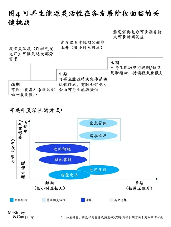 光伏和风电将在2050年成为主要能源,占全社会发电量的83%,而鉴于光伏和风电都有连续性较差、存在地理限制、容易出现短期内过剩或短缺等特点,将使得电力系统的灵活性受到进一步威胁。麦肯锡认为,应通过建设以下三方面的能力来提升电力系统灵活性(见图4)。