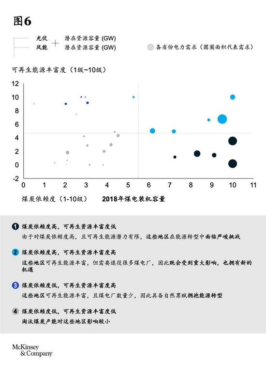 若电力行业碳排放需在2050年“清零”,燃煤电厂将不可避免地退出历史舞台。中国目前的燃煤发电装机容量达1,100GW,超过50%需在2040年前逐步淘汰。虽然中央及各省正陆续出台逐步淘汰燃煤电厂的政策,但落地过程中不仅面临着供电稳定性挑战,也一定程度影响了煤炭高度依赖区域的短期经济增长。麦肯锡将中国各省按煤炭依赖程度和可再生能源的丰富程度进行了划分(见图6),对于不同类型的区域,应采取不同的煤电退出路径。