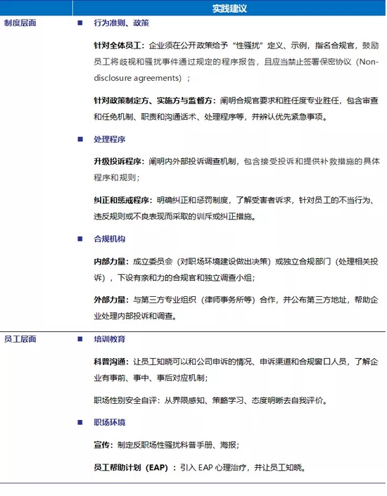职场性骚扰问题最终会阻碍企业的创新和进步。职场性骚扰问题的预防和解决一般由人事部牵头,合规、法务等部门参与。机制作为防范入口,可以从以下两个层面进行具体实践: