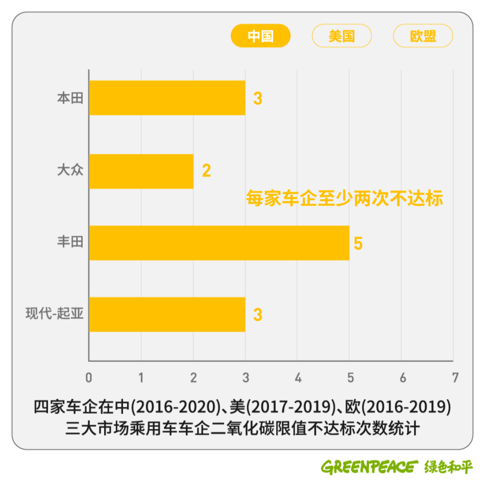 报告数据显示,2016-2020年间,四家车企在中国均至少有两次不达标,其中丰田五次不达标,本田与现代-起亚三次不达标,大众则有两次。