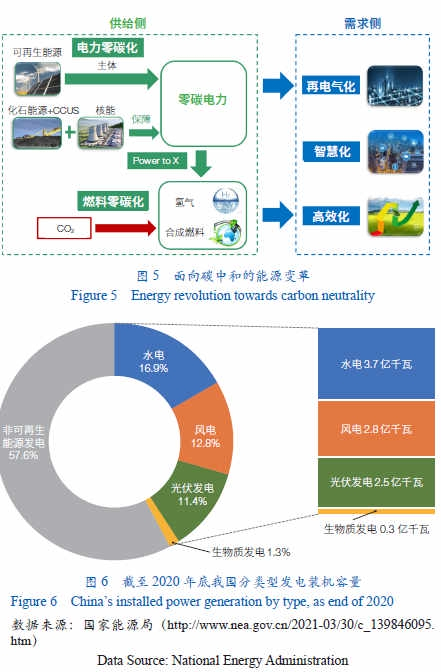 碳中和是一场绿色革命,将构建全新的零碳产业体系。如果没有颠覆性、变革性的技术突破,不可能实现碳中和。未来能源变革将呈现“五化”:从能源供给侧看,是电力零碳化、燃料零碳化;从能源需求侧看,能源利用高效化、再电气化、智慧化(图5),最终使我国建成以新能源为主体、化石能源+二氧化碳捕集利用与封存(CCUS)和核能为保障的清洁零碳、安全高效能源体系。