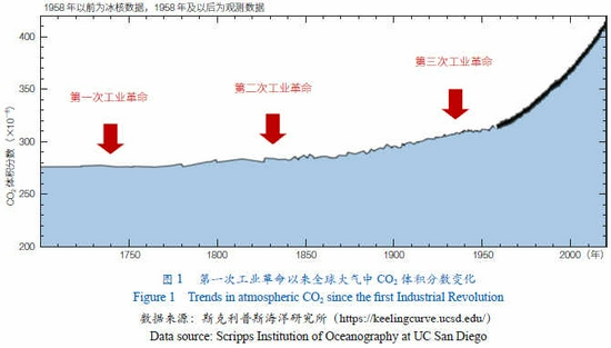 气候变化是当今全球面临的重大挑战之一。自第一次工业革命以来,煤、石油、天然气等化石能源的发现和利用极大提高了劳动生产率,推动了人类社会大繁荣、大发展,同时也产生了严重的环境问题和气候变化问题。200多年来,化石能源燃烧所产生的二氧化碳(CO2)累计已达2.2万亿吨,全球大气中CO2浓度持续上升。特别是近半个多世纪来,CO2浓度呈现快速增长的趋势(图1),2021年4月大气中CO2的体积分数已达到了 419×10−6,全球地表平均温度已升高 1.1℃。2018年联合国政府间气候变化专门委员会(IPCC)发布《全球升温1.5℃特别报告》指出已经观察到全球气温升高的事实,以及气温升高给人类造成的影响远远高于早期预测,2℃的温度升高给世界造成的影响将难以承受,人类必须把温度升高控制在1.5℃。以CO2为主的温室气体排放所导致的全球气候变暖,已成为全球性的非传统安全问题,严重威胁着人类的生存和可持续发展。