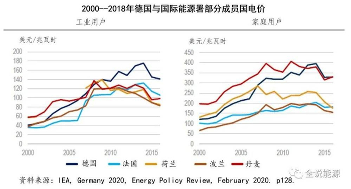 2018年,尽管能源密集型行业的价格大幅下降,但德国在国际能源署成员国中工业电价排名第三,其中税收占整个工业电价的48%,是国际能源署成员国中最高的;家庭用户支付的总电价中,大约一半是公共费用,仅次于丹麦,排名第二。