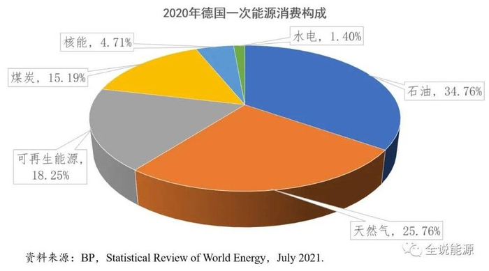 具体细分,德国的能源消费高度依赖传统的化石能源。2020年,德国一次能源消费结构中,石油是第一大能源来源,占比34.76%;天然气第二,占比25.76%;可再生能源第三,占比18.25%;煤炭第四,占比15.19%;核能第五,占比4.71%;水电第六,占比1.4%。