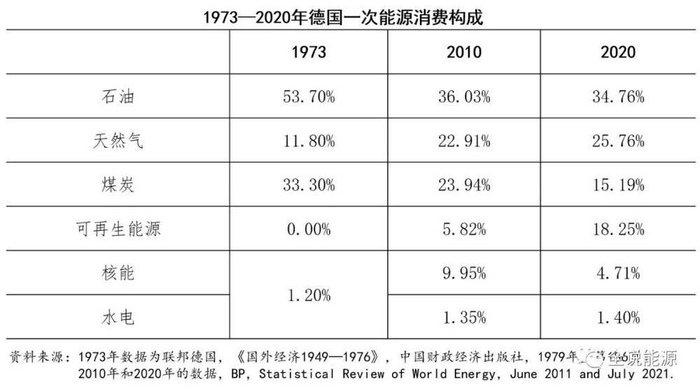 将时间线拉长,就在实现碳达峰时的1973年,当时的联邦德国,即我们通常所称的西德一次能源消费结构中,石油、煤炭和天然气是绝对主体,还没有可再生能源的统计数字。正式提出能源转型的2010年,石油、煤炭和天然气仍是德国能源消费的绝对主体,核能排在第四的位置,可再生能源排名第五。到了2020年,可再生能源排名虽然上升到了第三位,但石油、煤炭和天然气三大化石能源仍占据着德国一次能源消费的主体地位,与2010年对比,可再生能源抢占的更多是煤炭和核能的市场份额。