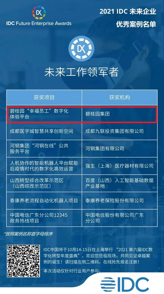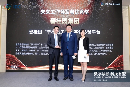 10月14-15日,2021 IDC数字化转型年度颁奖典礼于上海浦东举行,碧桂园“幸福员工”数字化体验平台荣摘【未来工作领军者】奖。
