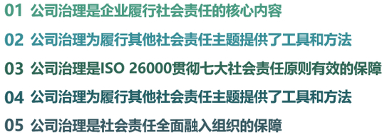 公司治理(G)通常是从利益相关方角度出发,指涉及至公司运营决策、战略规划等过程中的公司治理因素。ISO 26000《社会责任指南》中将公司治理(G)置于了与“E(环境)”和“S(社会)”完全不同的定位,并为其作出了以下定义: