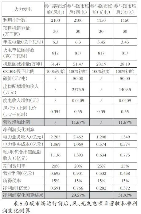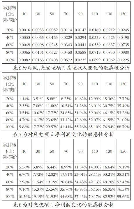 测算结果(如表5所示)表明,对于风电项目,如果项目产生CCER全部按50元/吨价格出售,则企业营收可增加11.67%,净利润增加29.57%。对于光伏发电项目,企业营收可增加11.67%,净利润增加31.93%。