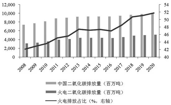 火力发电是我国主要的发电方式,发电环节二氧化碳的排放主要源于煤炭等化石燃料的燃烧,每度电大约耗标煤0.34千克,按煤中碳含量70%计算,产生二氧化碳约0.87千克,按2020年全国火电发电量为53300亿度计算,产生二氧化碳约为46.5亿吨,实际统计数据为51.2亿吨,占我国2020年二氧化碳总排放量比重为51.76%(如图1所示)。