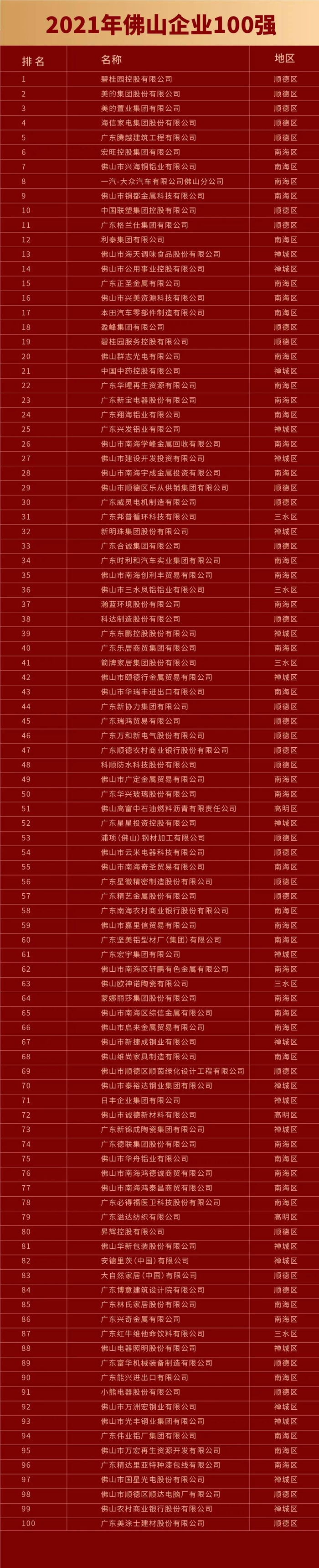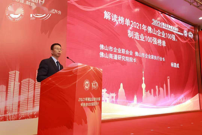据介绍,佛山发布史上第一个百强企业榜单在2019年由佛山市企业联合会、佛山市企业家协会正式发布,得到社会各界的高度关注,全国近50家媒体刊发消息和评论。2021年,是第三次对该榜单进行发布,同时还首创性地推出“2021佛山企业制造业100强”榜单,以此展示佛山的大企业实力、城市竞争力以及城市形象。