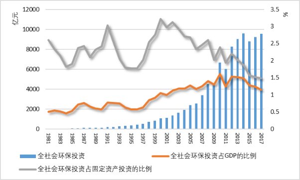 环保投资指以环境保护为目的的所有设施和设备的投资,属于固定资产投资范畴,有广义和狭义之分。中国一直沿用原国家环保总局发布的《关于建立环保投资统计调查制度的通知》(环财发〔1999〕64号)界定的“环境污染治理投资”,包括工业污染源治理投资、建设项目“三同时”环保投资以及城镇环境基础设施建设投资三个部分。1981—2017年,中国全社会环保投资由25亿元增加到9538.9亿元,呈快速增长趋势。
