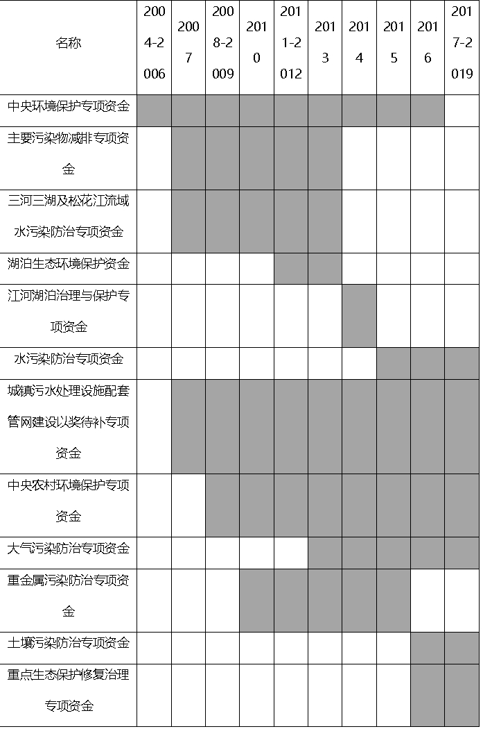 注:城镇污水处理设施配套管网建设以奖代补专项资金相继更名为城市管网专项资金、城市管网及污水治理补助资金;中央农村环境保护专项资金更名为农村环境整治资金;水污染防治专项资金更名为水污染防治资金;大气污染防治专项资金更名为大气污染防治资金;深色框表示该年度拨付