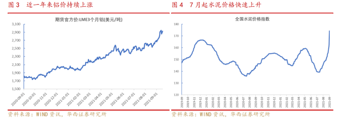 同时由于供给收缩,高耗能工业品价格普遍出现明显上涨:螺纹钢价格在今年5月达到高点;今年3月起煤价大幅上升,且呈现增速加快趋势;铝价在近一年来持续上涨;水泥价格自今年7月起同样快速上升。