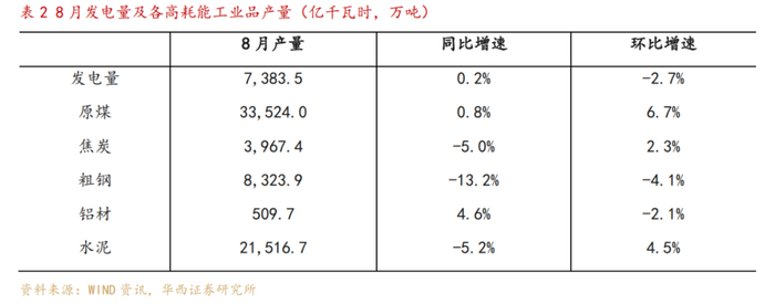 从国家统计局公布的主要工业品产量中可以观察到“能耗双控”政策趋严对高耗能工业品生产的影响。例如,8月全国发电量出现环比下降,焦煤、粗钢以及水泥产量同比明显回落,铝产量同样出现环比收缩。
