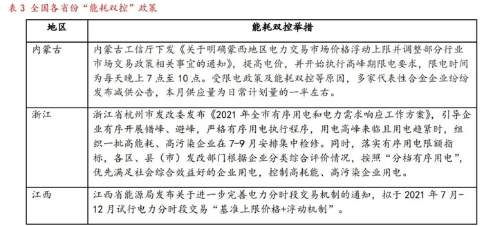为积极响应能耗双控政策,全国各省份纷纷出台了一系列举措,通过限制高耗能企业用电总量、提高电价、限制用电时段等方式促进能耗减排,具体执行措施见下表。