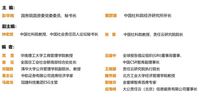 国务院国资委党委委员、秘书长彭华岗,中国社科院经济研究所所长黄群慧担任主编,知名高校、投资机构、研究机构等ESG领域专家学者参编。