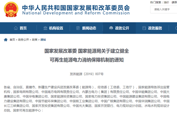 2019年5月,国家发改委、国家能源局印发《关于建立健全可再生能源电力消纳保障机制的通知》(发改能源〔2019] 807号),提出绿证作为市场主体完成消纳责任权重的补充方式。